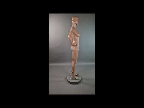 Pilno ūgio moteriškas manekenas - skirtas rūbų demonstravimui ir pardavimui. Sukama ir nuimama galva. Plastikas. Su veidu. Kūno spalvos. Padas-atrama įeina į komplektą. Manekeno išmatavimai: pečiai 37 cm, krutinė 81 cm, liemuo 62 cm, klubai 86 cm, ūgis 177 cm, batų dydis 36.
